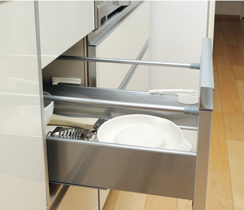 ・引き出しが約3cm開いたところでロックします。また、バーを下方に押すだけで解除でき、引き出すことができます。
