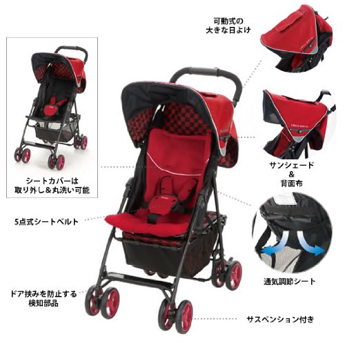頼れる収納力でお出かけもラクラク!国内最大級(2013年10月時点)の大型バスケット搭載の実力派ベビーカーです。こちらはレッド。4か月から4歳まで使える超ロングユース設計。一体型ハンドルや振動を軽減するサスペンション、メッシュシート、ワンプッシュ式バックルなど、お子様の安全を第一にママの使い勝手も考慮したこだわり設計が魅力です。