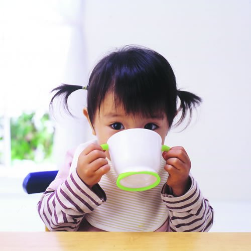 「UFはじめての両手カップ」は、すべりにくくやわらかい素材、エラストマーを採用した、お子様に初めて持たせるのに最適な食器です。