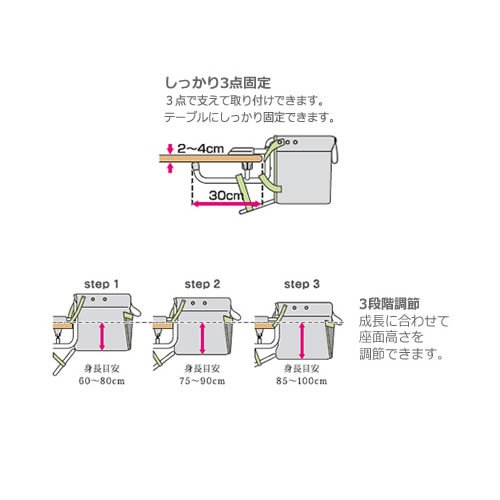 また、成長に合わせて座面高さを3段階に調節できるので、窮屈になりません。