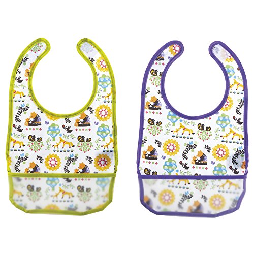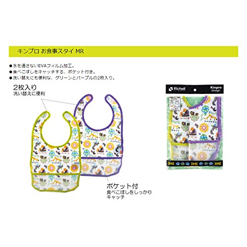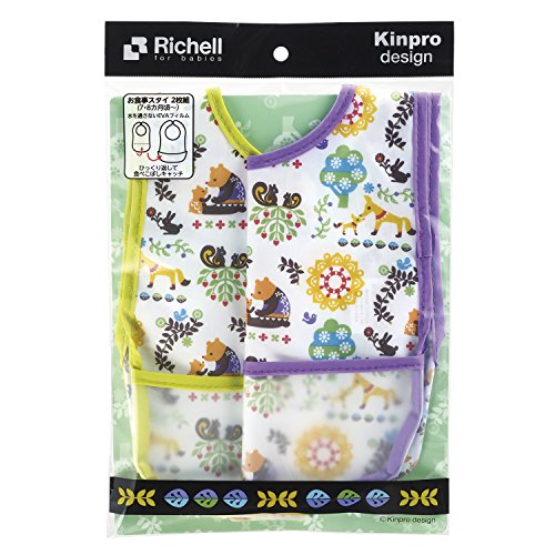 このスタイは下部の裏側の布地をひっくり返せば、前面にぽっこり張り出した袋ができて、食べこぼしをキャッチしてくれるタイプ。水を通さないEVAフィルムだから、汚れをふき取りやすく、液体をこぼされたって、へっちゃらです♪黄色とピンクの2枚入りで洗い替えにも便利。そして、生地に描かれているのは、黒とパステルカラーを基調とした、アーティスティックで可愛らしいデザイン「Kinpro」。これなら赤ちゃんとママのお食事がいっそう楽しくなりそうですネ♪着脱は簡単なマジックテープです。