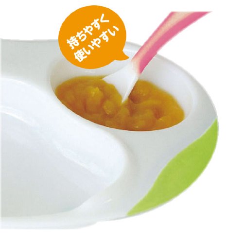 「NDベビースプーン」は、すべりにくくやわらかい素材、エラストマーを採用した、お子様に初めて持たせるのに最適な食器です。