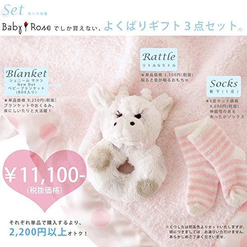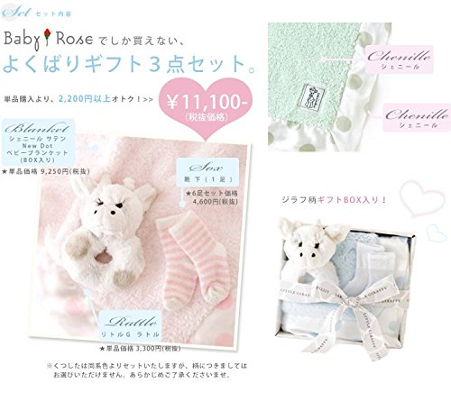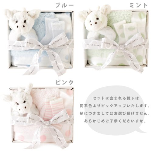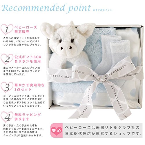 世界中のベビーに愛される≪Little Giraffe≫のベビーブランケット。 ベビーローズで売れすじNo.1の「シェニール サテン New Dot ベビーブランケット」に、愛らしい表情のキリンが付いた「Little G ラトル」、そしてモコモコとした肌触りであたたかい「ベビーソックス」1足をプラスして、限定ギフトセットにしました。BOX入りで見た目にも美しく、大事な方への贈り物に最適です。また、限定セットだけのスペシャルプライスですので、“Little Giraffe入門セット”としてご自宅用にもお勧めです。