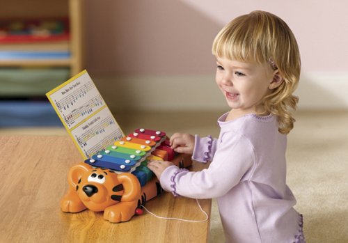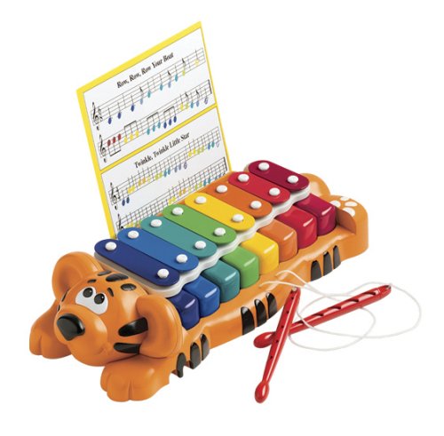 Tunes the Tiger is so talented, he can play happy melodies on his piano, and cool tunes on his xylophone;Strikers store neatly under Tunes' front paws for safekeeping;Handy cords keep the strikers from getting lost;A quality, classic and durable toy that encourages learning;Music sheets for 4 fun nursery songs fit in a special holder