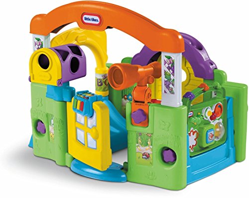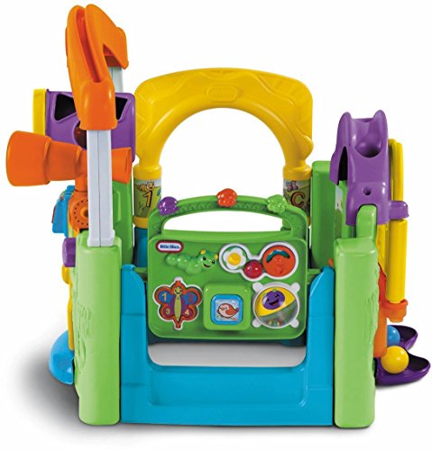 Little Tikes Activity Garden helps baby grow and develop. view larger View larger Little Tikes Activity Garden Interactive and engaging, Little Tikes Activity Garden combines essential play patterns with fun and whimsy to help baby grow and develop. Features: Multi-functional play center helps infants develop fine motor skillsSafe, durable and enclosed environment makes baby feel at homeThe play center easily transforms without tools into an open, two-sided play center for unlimited play possibilitiesTake-along play panel features a bead tumbler, spinner with mirror, spinning “gears” for gear play, clicking bugs, and a large button that when pressed, plays songsPlay panel can be adjusted to sit horizontally for sit-at playCrawl-through archwayShape-sorter mailboxWorking Tap-a-Tune piano sits atop the open-close doorMovable, look through telescopeOpen-close window shutters that feature a ball drop flower potEasy to assemble and transform without toolsAge Grade: 6 to 36 months
