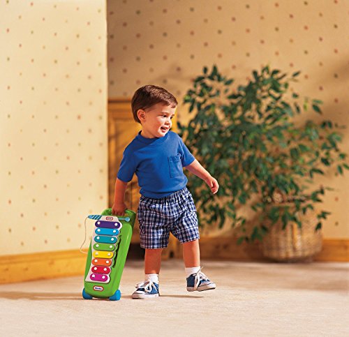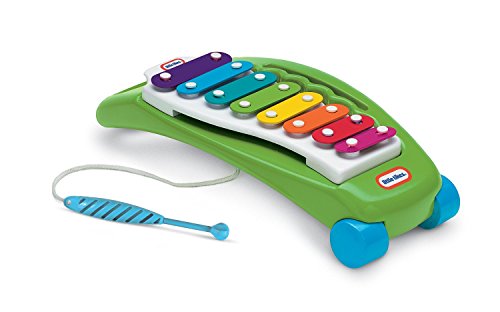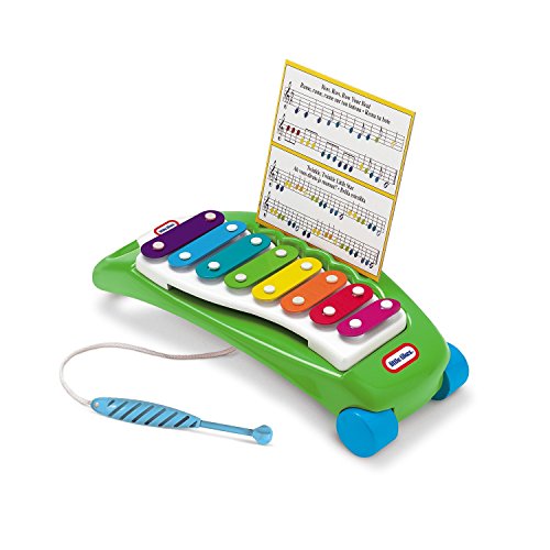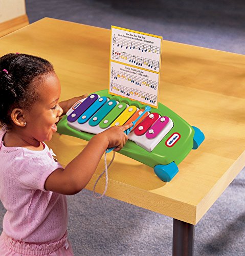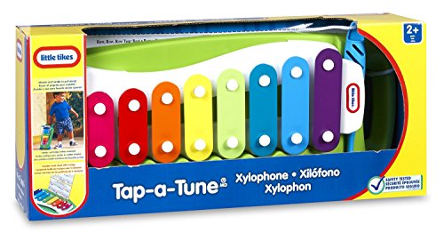 This classic xylophone lets infants and toddlers explore sound and music. Not only does this toy introduce notes, pitch and rhythm, the xylophone format helps improve hand/eye coordination and fine motor skills. The Little Tikes? Tap-a-Tune? Xylophone encourages kids to explore rhythm and movement at an early age! Features: - Colorful chimes - Provides creative, cause and effect play - Mallet cord is attached to keep from getting lost - Wheels and handle let kids take this toy with them wherever they go - Music card included (on the box bottom) to help teach children how to play along with a song - Extra sheet music on littletikes.com - Ages 18+ months