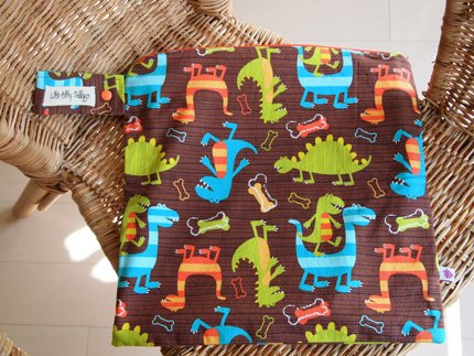 濃いめのブラウンにかわいらしい恐竜たちが楽しそうなデザイン。 チャックとスナップボタンがオレンジ色のところもおしゃれです♪