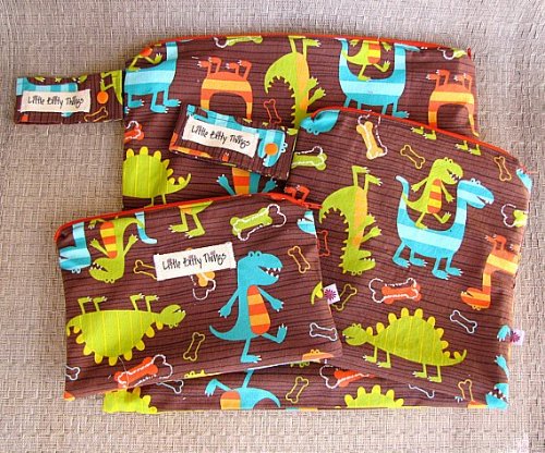 Medium ウェットバック 【 ファスナー ストラップ 付き 布 防水バック 】おむつポーチ スポーツポーチ シューズバックなど Michael Miller ディノデューズブラウン