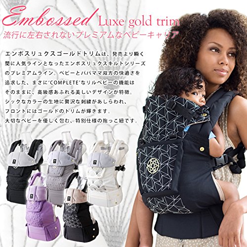 日本初登場!赤ちゃんの成長と月齢に合わせて6通りの抱っこができる、 新型ベビーキャリア【リルベビー コンプリート】! 今までのベビーキャリアにはなかった2種類のシートサイズ調整により、インサートなどの追加購入無しで新生児からトドラーまで個々の成長段階に合わせた安全で最適な抱き方が可能。特に前向き抱っこはママやパパと同じ景色を見ながら過ごせるので、赤ちゃんも大喜び! 首が座らない赤ちゃんの”首カックン”を防ぐ「ネックサポート」や、パパやママの腰への負担を軽減する「ランバーサポート(腰パッド)」が標準装備されているので、届いたその日から快適な抱っこができます。 【Embossed Luxe Goldtrim(エンボスリュクスゴールドトリム)】は、発売以来またたく間に人気シリーズとなった「エンボスリュクスキルト」のプレミアムライン。シックなカラーに豪華な刺繍が施され、特別仕様のロゴとゴールドトリムがさりげない高級感を演出します。これまでのリルベビーの画期的な機能はそのままに、より都会的な印象をプラスしたプレミアムなベビーキャリアは、時代や流行に左右されないスタイリッシュなパパ・ママにぴったり。 エンボスシリーズは通気性にも優れた軽めの素材を使用しています。また、赤ちゃんの肌に触れる裏地には、スウェードのような滑らかな肌触りマイクロファイバーを採用。赤ちゃんを優しく包み込みます。