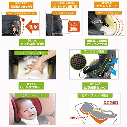 ●トリプルガードプロテクトで硬さの異なる3層の側壁で、大切なお子様の頭部を側面衝突からしっかり守ります。●ハーネスアジャストが7段階で適切な高さに簡単に調節でき、ミスユースを防ぐことができます。●優しくガードするモールドクッションをお子様の腰回りに配置して、つつみ込むようにしっかり守ります。●赤ちゃんの頭を包み込んで、眠っててもしっかりサポートします。●新生児の自然な姿勢をキープしやすい独自のクッション形状●まるでソファーのようにふかふかで優しいクッション素材をたっぷり使用してます。●汗っかきな赤ちゃんのために、3Dメッシュ生地を採用。●サイズ:W44.5×D54×62.5cm●本体重量6.9kg●対象年齢:新生児~4歳迄●対象体重:2.5kg~18kg●取り付け方式:3点式シートベルトによる固定●生産国:日本