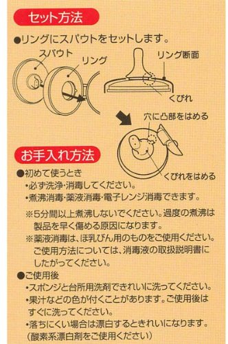●【商品説明】●「ベビーマグ用替えスパウト」は、レック『ANベビーマグ(スパウト)』に適応したベビーマグ用替えスパウトです。●乳首からの移行がスムーズに行える、赤ちゃんの口に合わせた形状です。●口にやさしいやわらかいシリコーン樹脂製で、熱に強く丈夫で長持ちです。●5ヶ月頃から。●【使用方法】●セット方法・・・リングにスパウトをセットします。●【お手入れ方法】●【初めて使うとき】●必ず洗浄・消毒してください。●煮沸消毒・薬液消毒・電子レンジ消毒できます。●※5分間以上煮沸しないでください。●過度の煮沸は製品を早く傷める原因になります。●※薬液消毒は、ほ乳びん用のものをご使用ください。●ご使用方法については、消毒液の取扱説明書にしたがってください。●【ご使用後】●スポンジと台所用洗剤できれいに洗ってください。●果汁などの色が付くことがあります。●ご使用後はすぐに洗ってください。●落ちにくい場合は漂白するときれいになります。●(酸素系漂白剤をご使用ください)●【ご注意】●※この商品は「ANベビーマグ(スパウト)」の替えスパウトです。●使い方・使用...