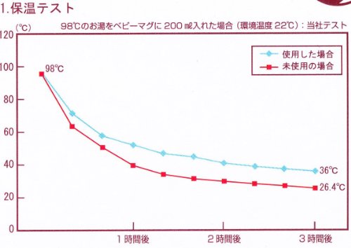 98度のお湯をベビーマグに200ml入れた場合の保温テスト結果。 ※メーカー実施テストより