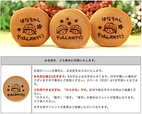 - ★名入れ・文字入れ対応商品★ 卒園祝いのどら焼きです。1行目に「お名前」を最大5文字までお入れします。ご注文後に、注文番号をお書きの上で、どら焼きに入れるお名前と日付をご連絡ください。利用できる文字は、「ひらがな」です。記号や絵文字のご利用はご遠慮ください。「カタカナ」「数字」「英字」「漢字」の場合はフォントが変更になります。ご了承ください。宛先:cs1@ai-online.co.jp