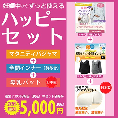 選べるカラー長袖マタニティパジャマが入った! 3点セットのハッピーセットです。 【長袖マタニティパジャマ】 ・夜空のネコ 【カラー】A-サックス、B-杢グレー(カラー選べます!) 【サイズ】マタニティM-L(バスト:86-101cm、腹囲:78-110cm、着丈:90cm) ・綿100%のやわらか素材で、ママはもちろん赤ちゃんにも安心! ・授乳も寝たままらくらくできる人気のマタニティパジャマです。 ・ゆったりサイズなので、産前・産後(授乳期)まで幅広く着用できます。 【検診らくらく全開インナー】 ・放熱保温、吸熱冷却の97.6F素材一枚でオールシーズン快適! ・薄手で収縮性も良く体にフィットするのでアウターの下に着てもスッキリ。 ・全開タイプなので病院での妊婦健診や産後の授乳に最適です。 【カラー】ブラック、チャコールグレー(カラーはお選び頂けません。) 【サイズ】マタニティM-L(バスト:86-101cm、腹囲:81-110cm) 【母乳パット】 ・日本製の母乳パット ・お肌にあたる部分は、柔らかな起毛素材。乳首をやさしく守り、いつもさらさらの肌ざわりです。 ・高吸水性を誇るアクリル吸水不織布を使用。すばやく、たっぷりとお乳を吸収して逃がしません。 ・パット表面は特殊はっ水加工。モレ・ニジミを防ぎます。通気性が良く、ムレを発散させます。 【品質】 保護布:ナイロン100% 吸水層:アクリル70%、キュプラ30% はっ水布 ポリエステル100%
