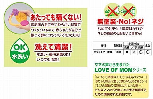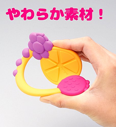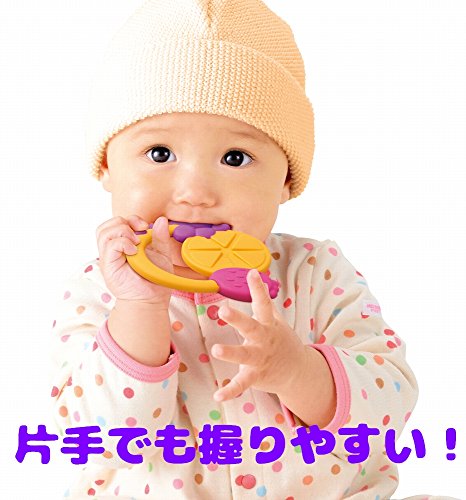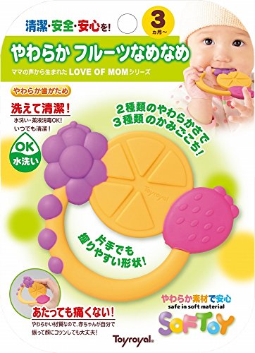 やわらかいからこわれない。SOFTOY。 ママの声から生まれた赤ちゃんにやさしいLOVE OF MOMシリーズ。 やわらかい材質なので当たっても痛くなく、赤ちゃんが自分で振って顔にコツンしても大丈夫! 塗装はがれの心配もない無塗装、小さな部品もないネジ不使用です。 水洗い、薬液消毒OKなのでいつでも清潔です。 片手でももちやすい、フルーツの形の歯固めです。 2種類のかみごこち。