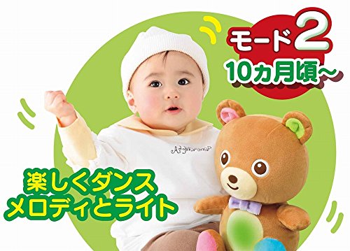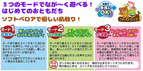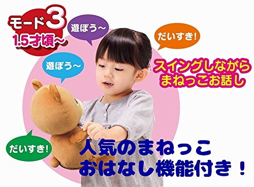 3つのモードで長く遊べるはじめてのおともだち! 人気のまねっこお話し機能や、楽しくダンスしたり、ポワ~ンと光るライト付き。かわいいくまさんはソフトベロア生地でやさしい肌触り。 [モード1] お誕生~癒しのライトとおやすみメロディ おやすみメロディが流れながら、優しくオレンジ色の光がゆっくり点滅します。 ・キラキラ星、シューベルトの子守歌、ゆりかごの歌(3曲メドレー)15分タイマー付き。 [モード2] 10か月頃~楽しくダンス メロディとライト くまさんがダンスしながら元気なメロディが流れて、緑色の光が点滅します。 ・ハイホー、山の音楽家、森のくまさん(3曲選曲)オートオフ付き。 [モード3] まねっこお話 スイングしながら人気のまねっこお話機能でまねしてしゃべっちゃう!緑色の光が点滅します。15分タイマー付き。 <安全機構>ユニット駆動時に駆動部を無理に押さえつけるとOFFになりモーターの空回りを防ぎます。
