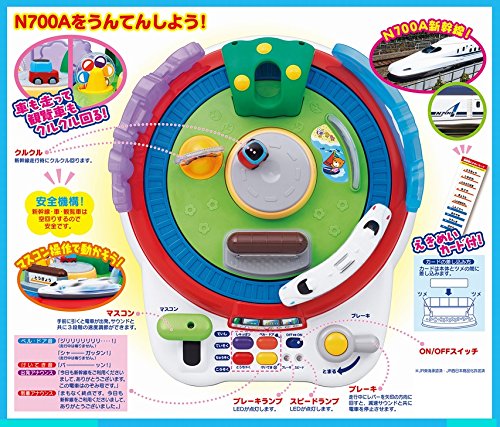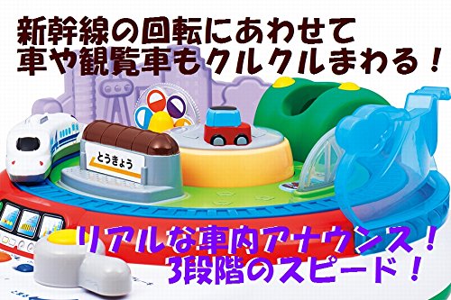- 新幹線と一緒に観覧車と車がくるくる! リアルなアナウンスとサウンドが4種類! マスコン操作で3段階のスピード調整可能。ブレーキバーを使ったリアルアクションで電車をぴったりストップさせよう! 差し替え可能な駅名カード付き。