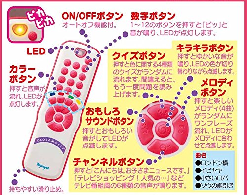 - 本物そっくりだから夢中になっちゃう! おうちのリモコンを持って離さない赤ちゃんに! うっかりジュースをこぼしても大丈夫! 安心の生活防水! 6つの日本語ボイスとメロディやおもしろサウンド! 正解・不正解がわかるクイズボタン機能で色が学べる!