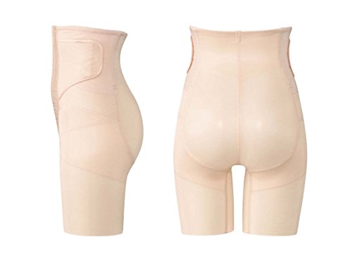 - パワー素材と裏打ちで下腹部をシェイプ・ウエストの9cm上までしっかりシェイプ・マジックテープでしめ具合を自由に調節・オーバックスタイルでキュッとヒップアップ・ふとももまですっきりサポート・裾はヘムの16枚仕立てでアウターにひびきにくい