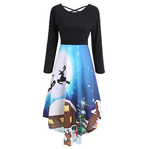 ワンピース POTOJP クリスマス柄 長袖 不規則 ドレス 大人用 着痩せ 膝丈スカート 女の子 コスチューム チュニック 女性用 コスプレ衣装 クリスマス パーティー 演劇 結婚式 宴会 日常着 デート フォーマルドレス (ブルー, L)