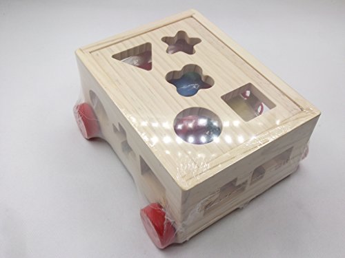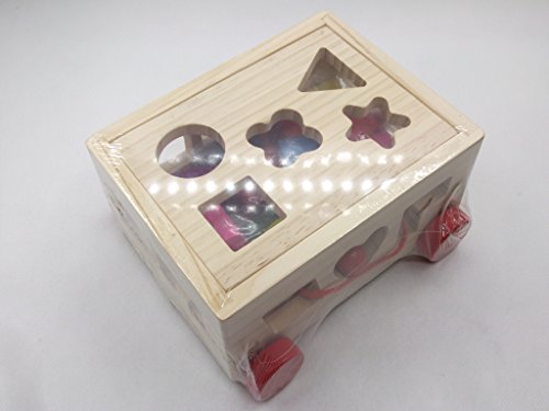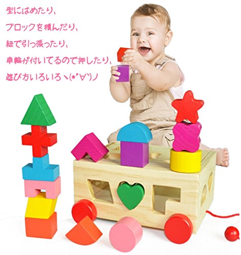 - 積み木のおもちゃです。15種類の形積み木を型にはめこんでいったり、車を紐を引っ張ったり、押したりもできます。