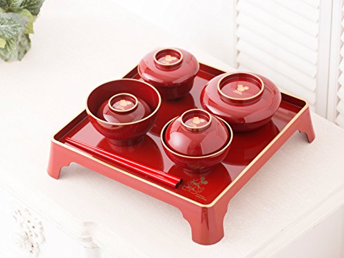 - (寸法は約、単位cm)膳:25.5x25.5x高さ5.8 お箸:18 飯椀:φ10x高さ6 汁椀::φ9x高さ8 つぼ椀:φ8.5x高さ7 平椀:φ10x高さ6