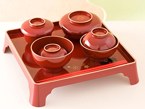 - (寸法は約、単位cm)膳:25.5x25.5x高さ5.8 お箸:18 飯椀:φ10x高さ6 汁椀::φ9x高さ8 つぼ椀:φ8.5x高さ7 平椀:φ10x高さ6
