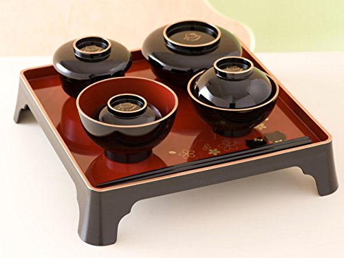 - (寸法は約、単位cm)膳:25.5x25.5x高さ5.8 お箸:18 飯椀:φ10x高さ6 汁椀::φ9x高さ8 つぼ椀:φ8.5x高さ7 平椀:φ10x高さ6