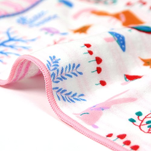 花やきのこ、森の動物たちをモチーフにした、 おとぎ話のような世界を表現したタオル『もり』。優しい色使いと手書き風とイラストで、思わず心がほっこりする、お子様にも、大人の方にも愛されるタオルです。 裏のボーダー柄が、表のガーゼ面に薄く透けてかわいさをプラス。ヘムの部分の縁飾りがより愛らしさを引き立てます。 柄のある表側はサラサラのガーゼ生地、裏は無撚糸パイルでとても柔らかく、お子様にも安心してお使いいただけます。 片面ガーゼのため畳んでもかさばりにくく、外出時のお供にも、幼稚園や保育園に持たせるタオルにもぴったり。ご自宅用にはもちろん、ちょっとしたお礼やプレゼントにもおすすめです。