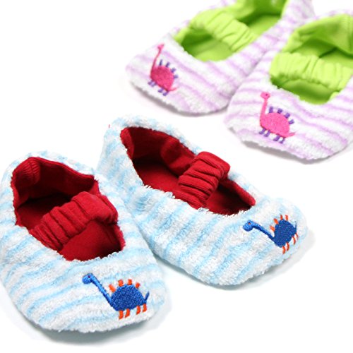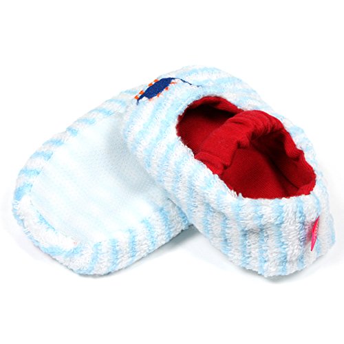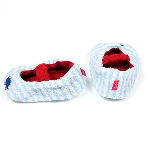 キュートな恐竜のワンポイント刺繍が入った、ストライプ模様のベビーシューズ(赤ちゃん用の室内履き)です。ふんわり心地よい肌ざわりで、赤ちゃんの足を冷えや障害物から優しく守ります。 甲の部分はゴム入りのストラップ付きで小さな足に優しくフィット。靴底には滑り止め加工を施した生地を使用しています。 安心素材のファーストシューズとして、贈り物にも喜ばれます。