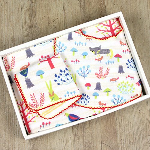 花やきのこ、森の動物たちをモチーフにした、 おとぎ話のような世界を表現した『もり』シリーズのギフトセット。思わず心がほっこりする、優しい色使いと手書き風とイラストで人気です。 スタイ、フェイスタオル、ミニハンカチの3点を同梱したベビーギフトセットです。