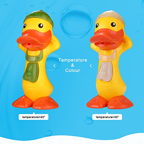 - 水温が変わると色が変わる: アヒルの緑色部分が温度を感知する。 水が40度のとき。 緑色の部分が白くなります。 赤ちゃんは同時に楽しいことができます。