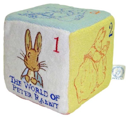 ピーターラビットの布製知育玩具です。タオル生地でやわらかな肌触りです。サイコロには鈴やフィルムが入っているのでリンリンカサカサ音がします。