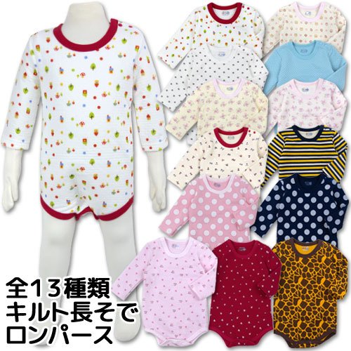 商品説明:ベアボックスよりキルト生地に可愛いプリントが盛りだくさん 全13種類の長そでロンパースです。