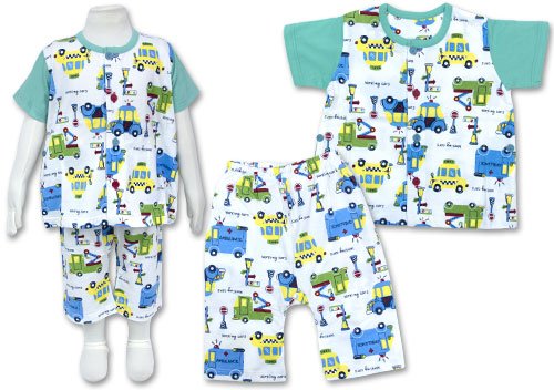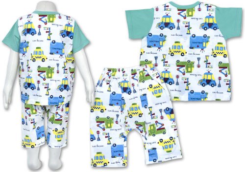 【BearBox】 ベアボックス 綿100% 働く車柄 七分丈パンツ 前開き 半そでパジャマ 80cm グリーン