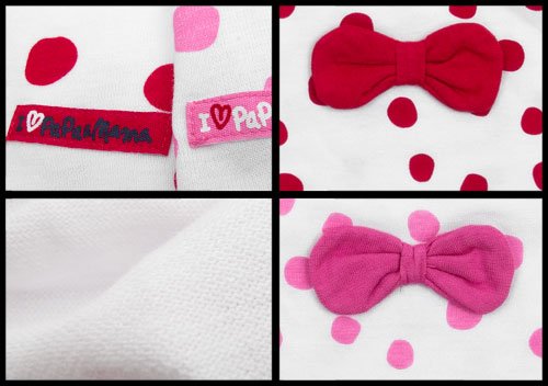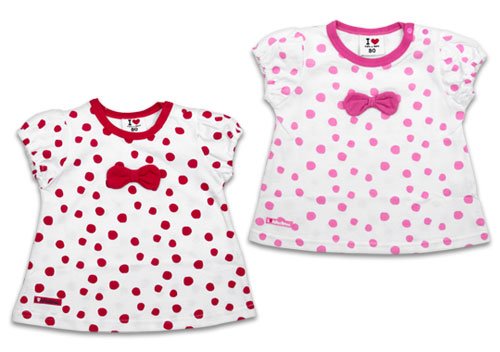 超人気アイラブパパ&ママから、Aラインとパフ袖の可愛らしい半そでTシャツです 汗を吸収しやすく、ニット生地では定番の天竺使用 左肩のスナップで着脱ラクラク。CUTEな全体のシルエットに、お胸のリボンがピッタリ。前身頃の左裾にはアイラブロゴタグ付きで、こっそり大好きパパ&ママアピール お色は水玉レッド、水玉ピンクの2色展開です。 サイズ80cm/90cm/95cm