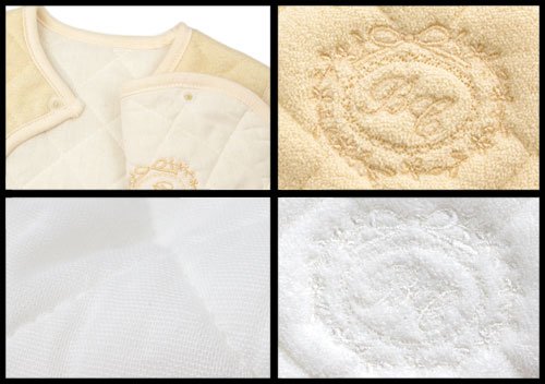 ふんわりとした肌触りの無撚糸パイルで作られた2層生地の間に、中わたをはさんで作られている柔らかなキルト生地を使用。
