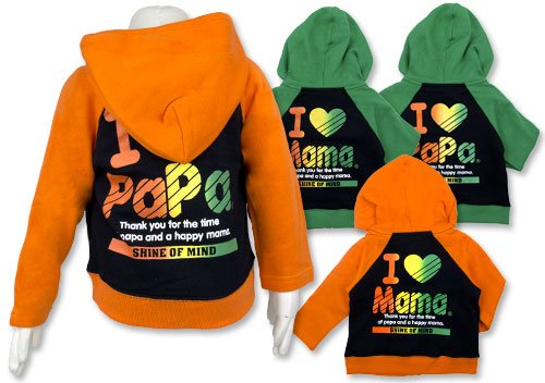 商品説明:アイラブパパ&ママのレインボーロゴパーカーです ふわふわの起毛でベビーちゃんもあったか。センターのチャックで着脱もラクラク 左右には便利なポッケ付 左胸と後にはアイラブパパorママロゴプリントで大好きパパママをアピール。レインボーグラデーションでとってもCUTEだね お色はパパ(グリーン・オレンジ)とママ(グリーン・オレンジ)の4色展開です