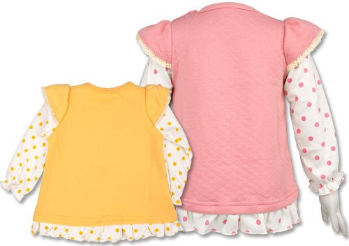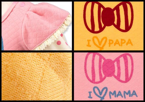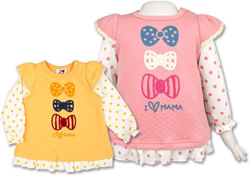 商品説明:大人気アイラブパパ&ママの裾フリルAライントレーナーです 2層の生地の間に中わたをはさんで作られている柔らかな厚みのニットキルトと、切替え袖と裾部分は保湿性・伸縮性に優れたスムス素材使用 左肩のスナップで着脱ラクラク フレンチスリーブからレースがチラリ。お胸には色んな柄のリボンプリントが可愛いっ。ふんわりとした生地と、可愛らしいリボンプリントとの相性抜群 切り替え裾フリル&お袖はドット柄 袖口はゴム入りです。お色はパパイエローとママピンクの2色展開