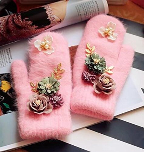JJdoレディース手袋手作り花 編織り厚手ふわふわ手袋 (ピンク)