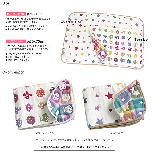 - 【ベビーケット クォーターサイズ】生産地:日本 素材:身生地:綿100%(6重ガーゼジャガード) パイピング:アクリル サイズ・重さ:約70×100cm・約293g 柄:アニマル、スター