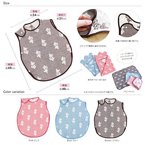 - 【ベビースリーパー】生産地:日本 素材:身生地:綿100%(4重ガーゼジャガード)、パイピング:アクリル サイズ:全体 約49×40cm、首回り 約31cm、肩幅 約34cm カラー:ピンク、ブルー、ブラウン