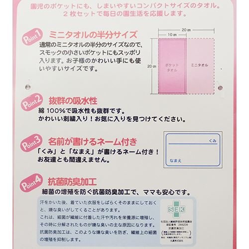 - 園児のポケットにもしまいやすい、コンパクトサイズのタオル。