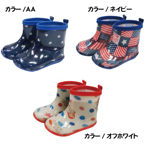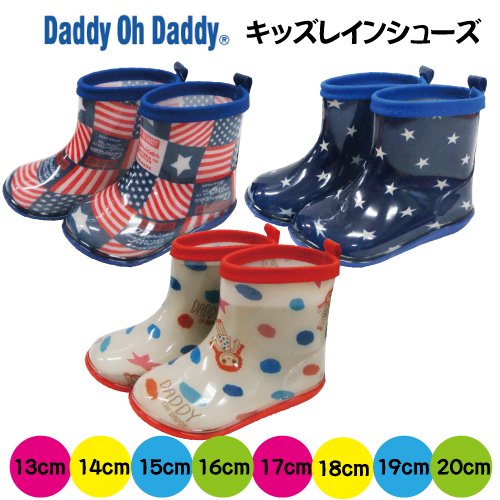 DaddyOhDaddy ダディオダディ レインシューズ 長靴 男の子にはかっこいいアメカジプリント、女の子にはかわいいダディ子プリント☆ 雨の日はもちろんお砂場遊びにも大活躍☆ お揃いのレインコート、傘もございます。 サイズ:13cm 14cm 15cm 16cm 17cm 18cm 19cm カラー:ネイビー オフホワイト AA 素材:PVC 中国製
