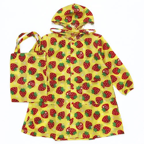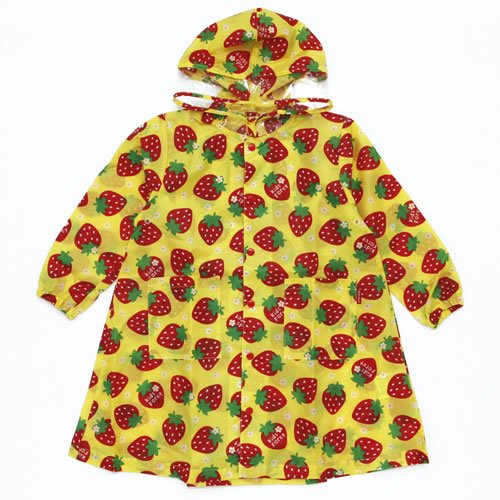 - 黄色い生地に大きなイチゴのプリントが全体に入ったレインコートです。