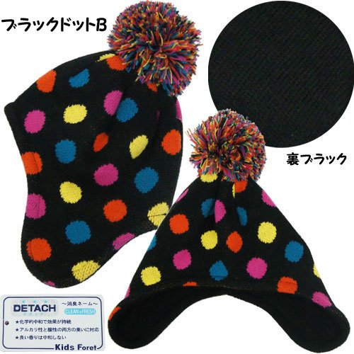 KidsForet キッズフォーレ 子供用帽子 ベビー帽 耳付 ニット帽 DETACH 消臭ネーム-ブラックドットB48~50cm