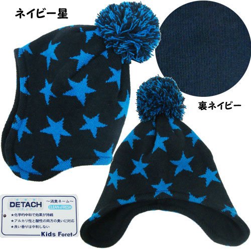 KidsForet キッズフォーレ 子供用帽子 ベビー帽 耳付 ニット帽 DETACH 消臭ネーム-ネイビー星48~50cm