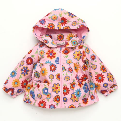 シャカシャカしたナイロン素材でお花の柄が全体に入ったフード付きのジップアップジャケット(ウィンドブレーカー)です。