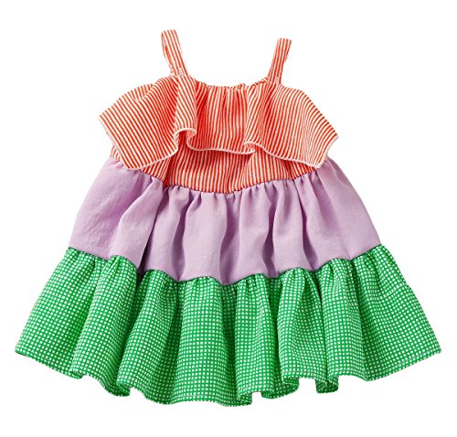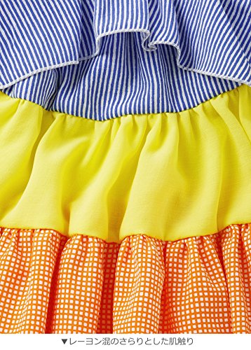 たっぷりギャザーと素材のハリ感でふわりと広がるティアードデザイン。子供らしいポップな色合わせと、レーヨン混のさらりとした肌触りが今からの季節にぴったりです。肩紐の長さは2段階に調節可能で、ボタンで取り外せます。