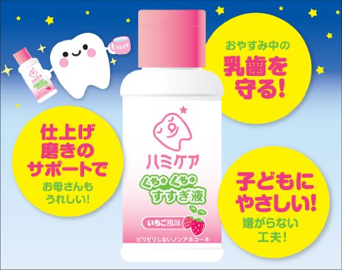 ●【商品説明】●「ハミケア くちゅくちゅすすぎ液 いちご風味 69ml」は、殺菌成分CPCが、お口のすみずみまで届いて奥歯の溝や歯のすき間に潜む原因菌を殺菌して歯垢の付着を防ぐ、子ども用マウスウォッシュです。●くちゅくちゅするだけでしっかりと歯垢の付着を防ぐことができます。●磨き残しの不安がある仕上げ磨きをしっかりサポート。●お子様も大好きないちご風味です。●ノンアルコール。●使用後お口を水ですすぐ必要はありません。●医薬部外品。●【使用方法】●日常のハミガキの後、お子様の口中に適量(約3ml)を付属の計量カップではかり、お口に含み、約20-30秒ほどすすいでから吐き出してください。●使用後お口を水ですすぐ必要はありません。●【使用上の注意】●内服液ではありませんのでお子様が飲み込まないようにご注意ください。●口中に異常があるときは使わないでください。●お子様の手の届かない所に保管してください。●高温又は低温の場所、直射日光のあたる場所には保管しないでください。●お子様がくちゅくちゅして吐き出せるようになったら使用できます。●【成分】●水(基材)、濃...